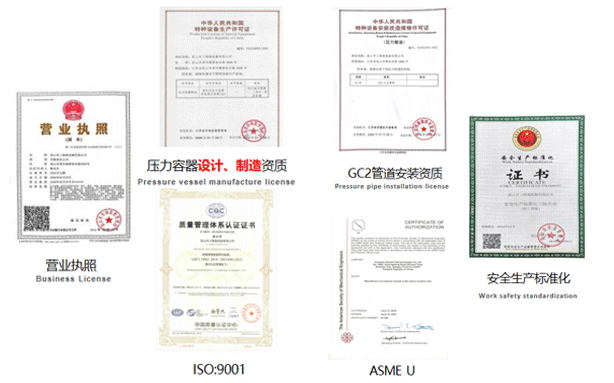 A2壓力容器制造許可證,D1/D2壓力容器設計許可證;GC2管道安裝許可證;ASME U/NB鋼??;ISO9001、ISO45001、ISO14001體系認證證書等。